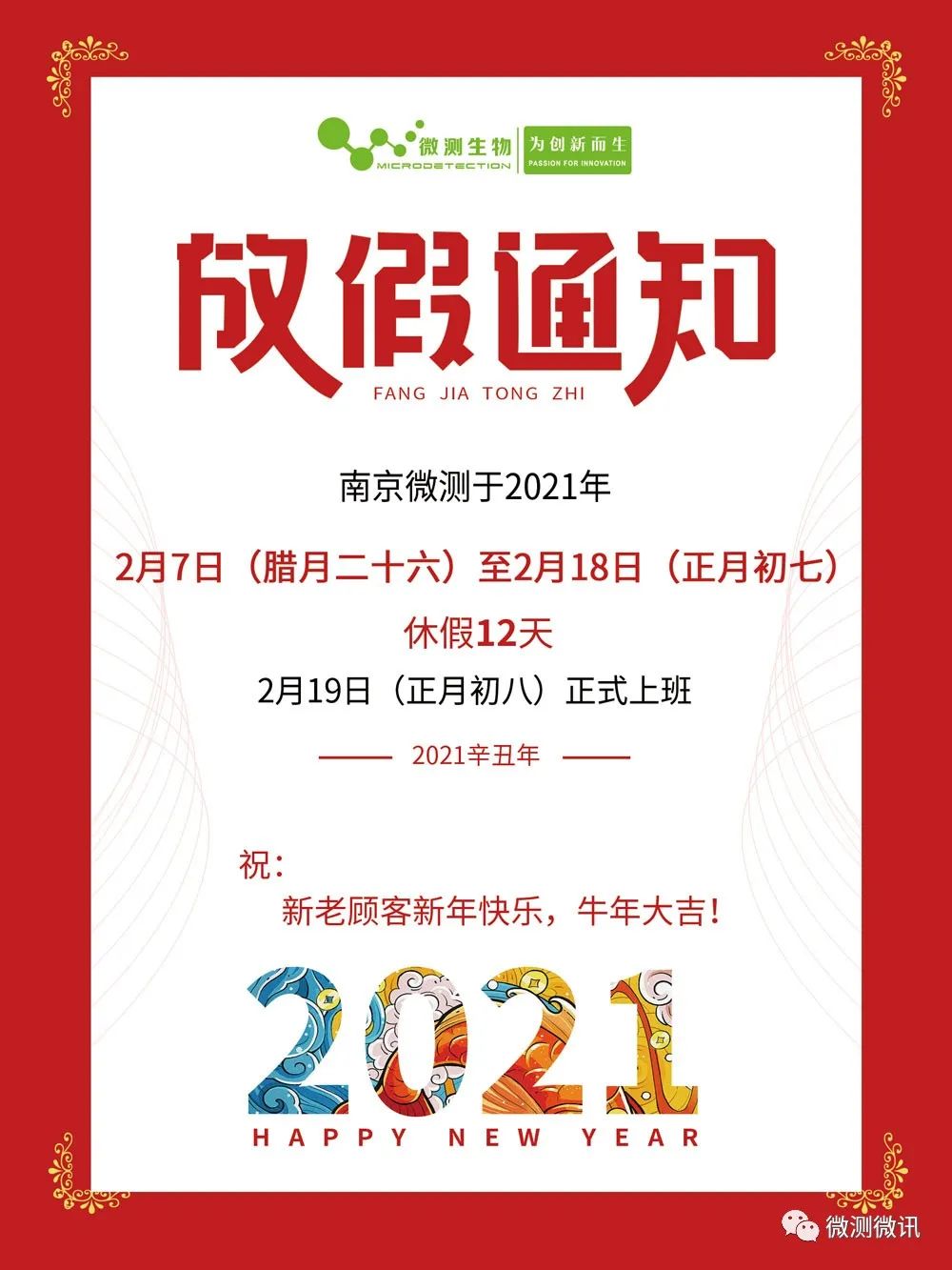 時(shí)光荏苒,歲月悠悠,轉(zhuǎn)眼間2020年已經(jīng)過去了,嶄新的2021年正向我們緩緩走來,南京微測根據(jù)國家規(guī)定,對(duì)2021年春節(jié)放假的時(shí)間安排如下: