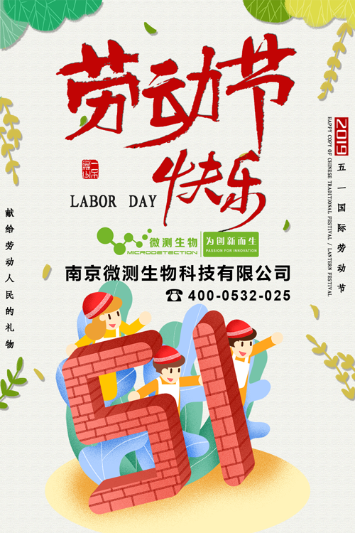 南京微測(cè)生物科技有限公司祝新老客戶朋友五一勞動(dòng)節(jié)快樂!友情提示:2019年5月1日起至2019年5月4日放假,共計(jì)4天,放假期間不發(fā)貨,5月5日上班恢復(fù)正常發(fā)貨。